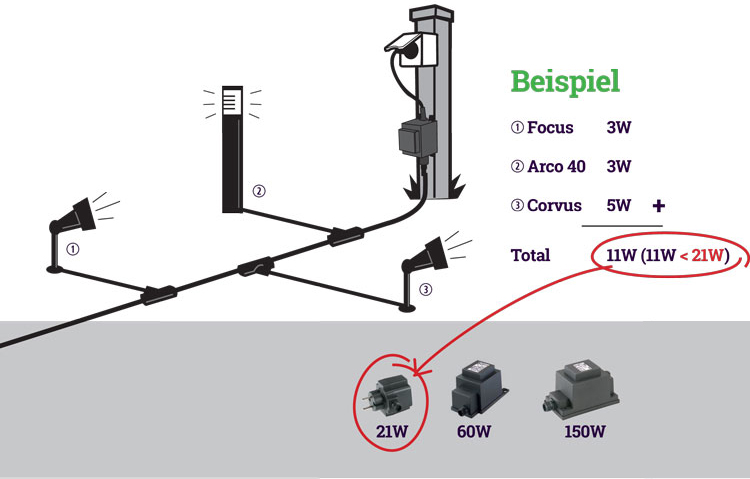 Die Gesamtleistung der gewählten Beleuchtung bestimmt die Leistung des Transformators. Addieren Sie dazu die Anzahl Watt der Lampen und der Zubehörteile. Die Wattzahl ist in der Beschreibung der jeweiligen Leuchte angegeben. Anschließend können Sie einen 24-, 60- oder 150-Watt-Transformator auswählen. Tipp: Achten Sie immer darauf, dass Sie etwas mehr Wattleistung zur Verfügung haben, falls Sie später Ihre Gartenbeleuchtung erweitern möchten.