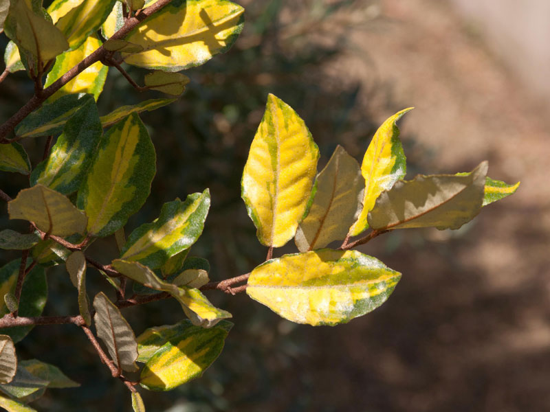 Ihren Namen verdient die Buntlaubige Ölweide zurecht - ihr auffälliges Laub variiert in den Farben Dunkel- und Hellgrün und einem größeren Farbanteil in leuchtendem Gelb. Die großen und ovalen Blätter sind ledrig und unterseits weißfilzig und verbleiben ganzjährig an der Pflanze. Damit ist das immergrüne Gehölz sommers wie winters ein wichtiger Strukturgeber im Garten. An den Trieben werden leichte Triebdornen ausgebildet.