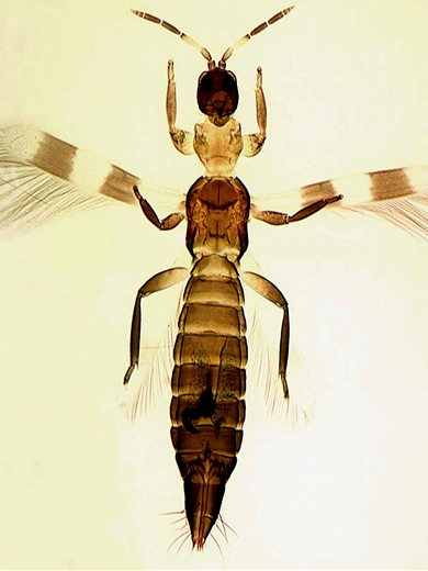 Thripse sind als Schädlinge an Zimmer- und Gemüsepflanzen weit verbreitet. Sie befallen besonders gerne junge Blüten und Blätter. Sie stechen dabei einzelne Zellen mit ihren Mundwerkzeugen an und saugen die Flüssigkeit heraus. Die Blätter erhalten dadurch eine silberfarbene Sprenkelung. Dieses Schadbild ist dem der Spinnmilbe zum Verwechseln ähnlich, nur dass Thripse auffällige, schwarze Kottropfen hinterlassen, was bei Spinnmilben nicht der Fall ist! Die Tiere sind 1 mm - 1,5 mm lang, bräunlich gefärbt und weisen auf dem Rücken dunkle Querstreifen auf. Sie bewegen sich sehr flink auf Blättern und Blüten und verstecken sich gern. Mit einer Lupe sind sie aber sehr gut zu erkennen.