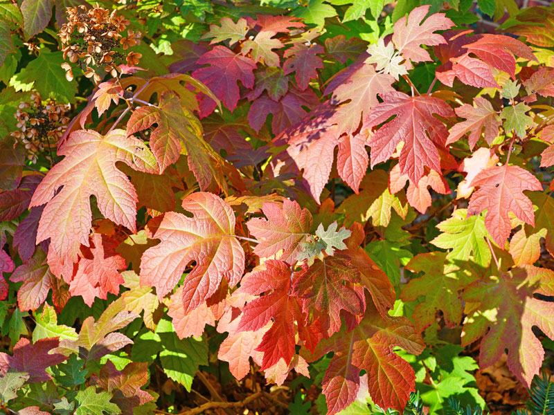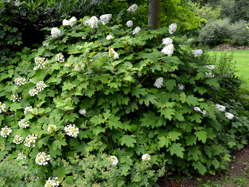 Der Namensgeber für diese Hortensien-Art ist das skurril geformte Laub, das nicht nur der Form halber an Eichenlaub erinnert, sondern auch eine tolle Herbstfärbung von burgunderrot bis hellorange aufweist. Das über den Sommer hinweg tiefgrün gefärbte Blatt ergibt einen schönen Kontrast zu den hellen Blüten.