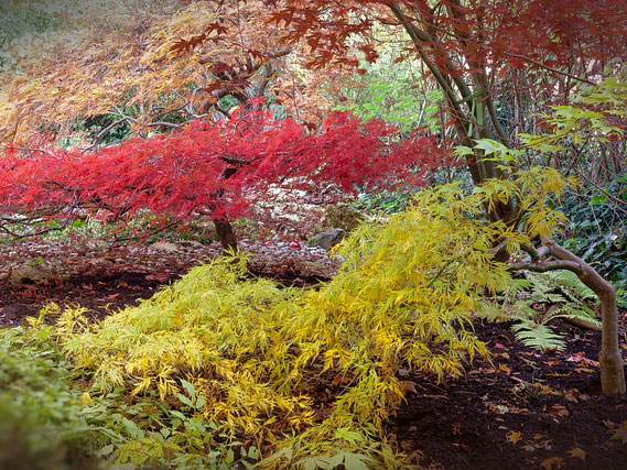 Wie sein Name unschwer vermuten lässt, sind die Acer japonica und Acer palmatum ursprünglich japanischer Abstammung. Glücklicherweise fühlt sich die orientalische Schönheit auch bei uns sehr wohl. Dieser Baum hat das Gewisse etwas an sich, das Ihren Garten verzaubern wird. Den Acer palmatum gibt es in unterschiedlichen Größen. Selbst für den kleinsten Garten findet sich unter diesen asiatischen Schönheiten die passende Pflanze. Von kleinbleibenden Sträuchern mit einer Wuchshöhe von nur 1,5 Meter, bis zu kleinen Bäumen mit einer Endhöhe von 7 Metern ist in dieser Kategorie alles vertreten. Besonders beliebt ist der japanische Ahorn auf Grund seines schönen Laubs. In erster Linie denkt man hier an die rotlaubigen Sorten, wie den Acer palmatum 'Atropurpureum' und den roten Schlitzahorn, welcher mit botanischem Namen als Acer palmatum 'Dissectum Garnet' bekannt ist. Diese wunderschönen Pflanzen setzen leuchtende Akzente im Garten. Besonders vor einem grünen Hintergrund kommt dies sehr gut zur Geltung. Daher wird der japanische Ahorn auch gerne in den Vordergrund einer Hecke gepflanzt. Das Grün einer Thuja oder eines Ligusters bietet einen tollen Kontrast. Doch gibt es den vielseitigen Ahorn nicht nur mit rotem Laub. Auch gelbe, bunt panaschierte und grüne Blätter stehen hoch im Kurs. So beispielsweise der buntlaubige Eschenahorn 'Flamingo', der mindestens genau so interessant aussieht, wie sein Name klingt. Auch der Korallen-Ahorn zieht die Blicke auf sich. Mit gelbem Laub und roten Trieben ist er eine absolute Besonderheit. Die kleinen Blüten des Acer palmatum treten hier verstärkt in den Hintergrund. Sie sind verhältnismäßig klein und unauffällig. Daher fallen sie der Beschreibung der Pflanze nicht weiter ins Gewicht. Ist der Sommer vorüber, beginnt die Glanzzeit des japanischen Ahorn. Bevor der Strauch seine sommergrünen Blätter fallen lässt, gibt die Pflanze im Herbst noch einmal alles und verzaubert uns mit seiner malerischen Herbstfärbung. Mit dieser wunderschönen Herbstfärbung verwandeln sie den Garten in eine Welt der bunten Farben. Trotz des nahenden Winters, strahlen die gelben, orangen und roten Blätter so viel Freude und Wärme aus, dass man die vorherrschende Kälte im Herbst für den Moment vergessen kann. Paradebeispiele hierfür sind der Schlitzahorn und der Feuerahorn, mit Blättern die im Herbst eine außergewöhnliche, burgund-rote Färbung erlangen. Der japanische Ahorn setzt weit mehr als dezente Farbtupfer. Er entfacht ein wahres Feuerwerk der Farben. Die schöne Herbstfärbung des Fächerahorns läd zum Verweilen und Genießen ein.
