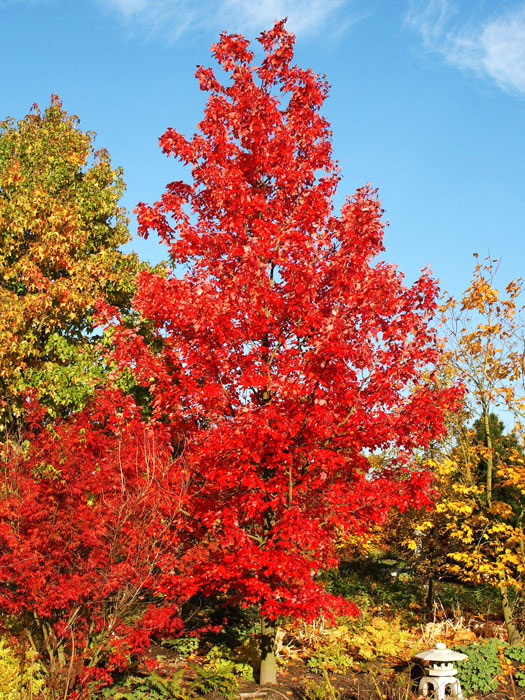 Schon während Frühjahr und Sommer ist das sattgrüne, glänzende Blatt des Amberbaums eine wahre Pracht. Auf den ersten Blick könnte man den Amberbaum für einen Ahorn halten, doch stellt man bei genauem Hinsehen deutliche Unterschiede fest. So zum Beispiel die scharf zulaufenden Blattspitzen. Fünf bzw. sieben an der Zahl. Der Liquidambar styraciflua ist sommergrün, so dass der Baum seine Blätter bis zum Winter alle abgeworfen hat. Dies wäre sicherlich schade, wenn da nicht der Herbst wäre, der uns für die kommenden, laublosen Monate entschädigt. Im Herbst beginnt sich das Laub des Liquidambar zu verfärben. Schnell weicht das satte Grün und macht Platz für leuchtendes, kräftiges Rot. Dieses zeigt sich in vielen verschiedenen Facetten, so dass schon ein einzelnes Blatt eine Herbstfärbung aus diversen Rot-Tönen aufzeigen kann. Im amerikanischen Amberbaum präsentiert sich der Herbst wirklich von seiner schönsten Seite. Kaum einer der anderen Bäume kann sich mit dieser prächtigen Herbstfärbung messen.