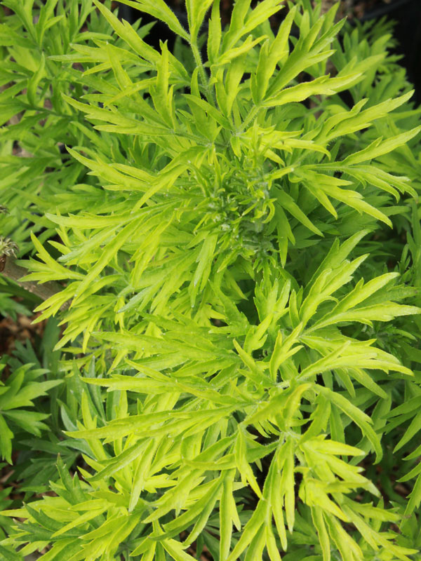 Mit seiner einzigartigen Kombination aus filigraner Blattform und leuchtender Blattfarbe zieht Sambucus nigra 'Golden Tower' alle Blicke auf sich. Die Blätter sind von gelbgrüner bis goldgelber Farbe. Ebenfalls auffallend für diese Sorte sind die büschelartig an den Triebspitzen austreibenden und anfänglich mit Flaum versehenen und stark geschlitzten Blätter. Die Pflanze ist laubabwerfend.