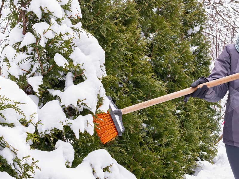 Die wohl wichtigste Maßnahme, um Schneebruch zu vermeiden, ist das rechtzeitige Abschütteln und Abklopfen von Schnee. Bei starken Schneefall sollten die gefährdeten Gartenpflanzen regelmäßig kontrolliert werden. Sollten große Schneemassen die Pflanze bedecken, muss der Schnee vorsichtig abgeschüttelt werden. Am Besten eignet sich hierfür ein Besen oder ein langer Stab. Besonders bei nassem und schwerem Schnee ist regelmäßige Kontrolle und schnelles Handeln wichtig.